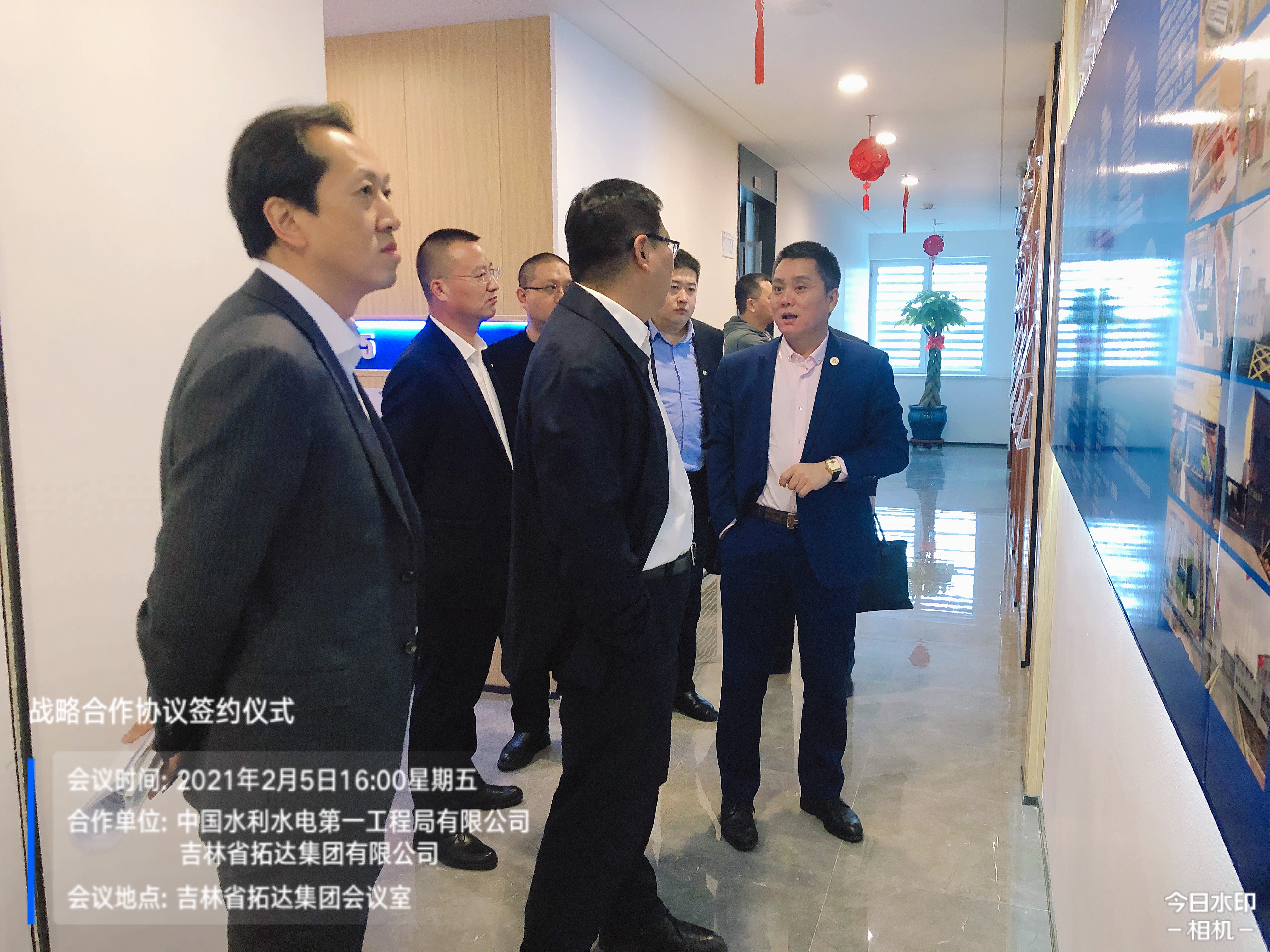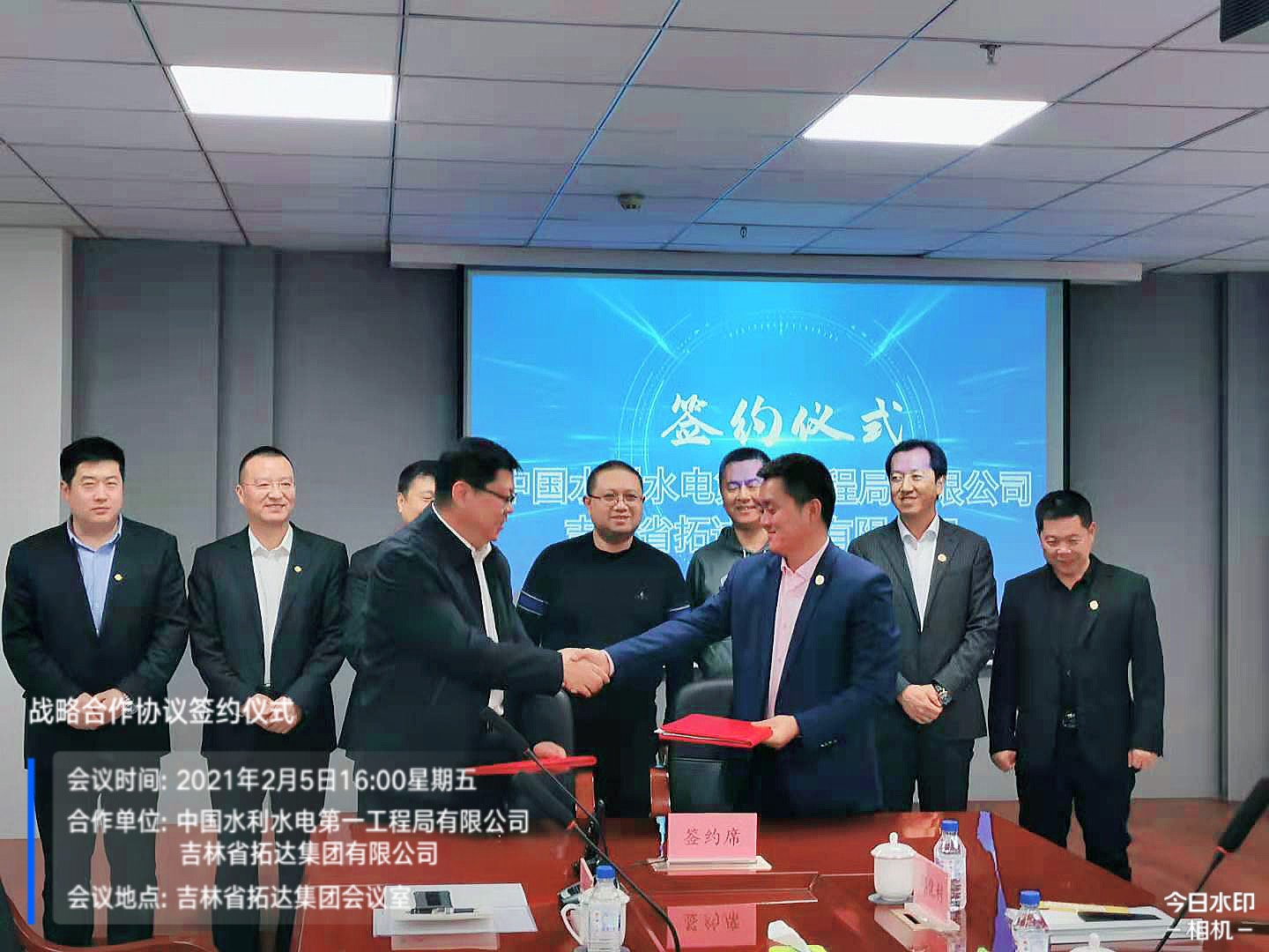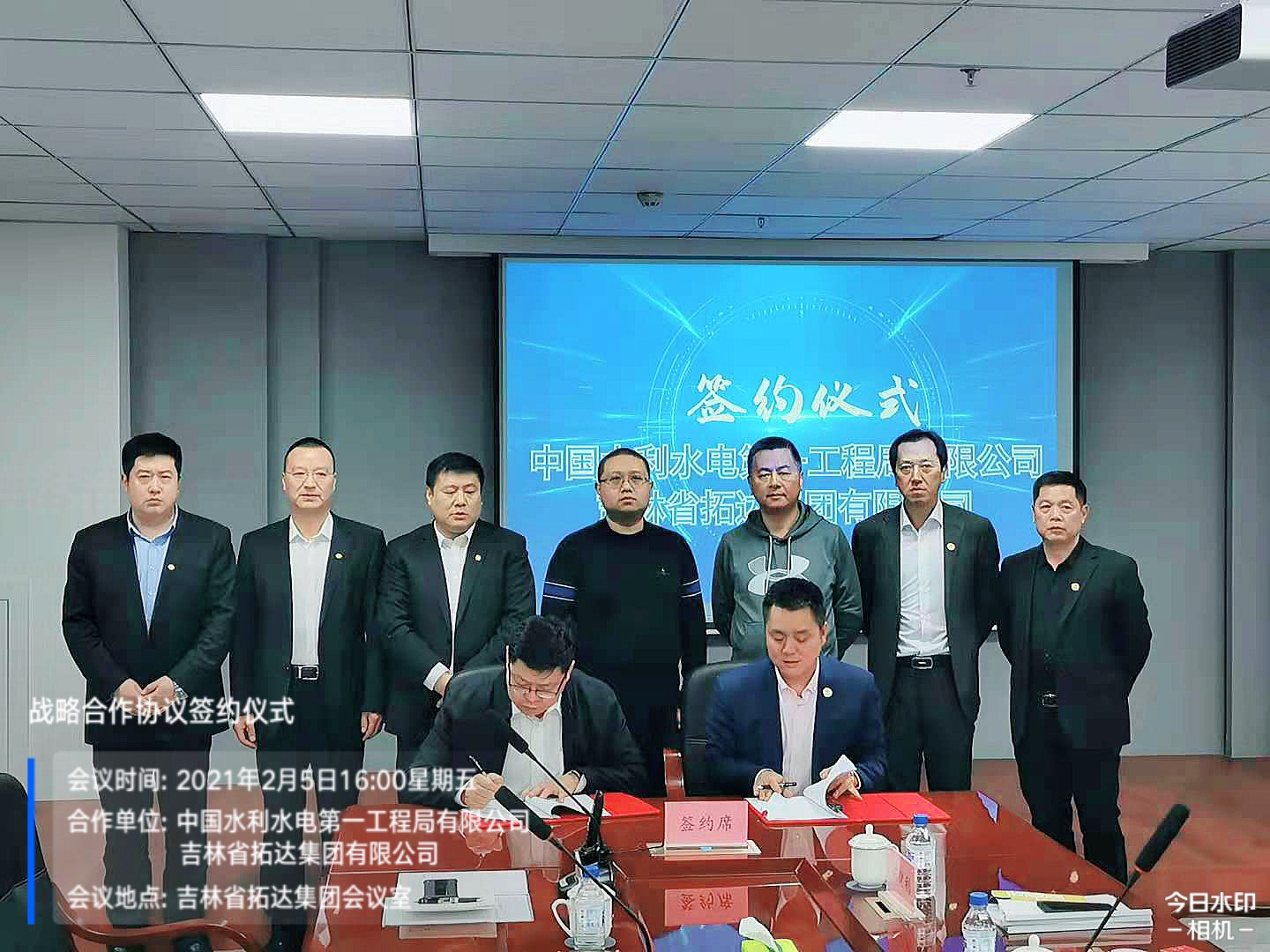 为认真贯彻落实习总书记“两山理论”重要指示精神,践行“一带一路”发展思想。遵照吉林省委、省政府部署要求,积极推动吉林省新基建“761”工程方案实施,吉林省拓达集团积极构建与央企合作伙伴关系,推动央企、民企强强联合,实现双方共赢。值此新春佳节到来之际,2021年2月5日下午,中国水利水电第一工程局有限公司与吉林省拓达集团有限公司签订《战略合作协议》。