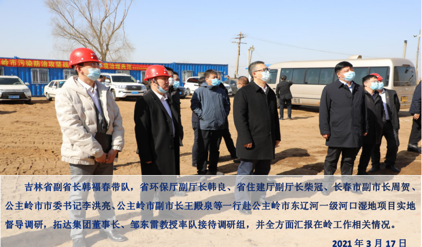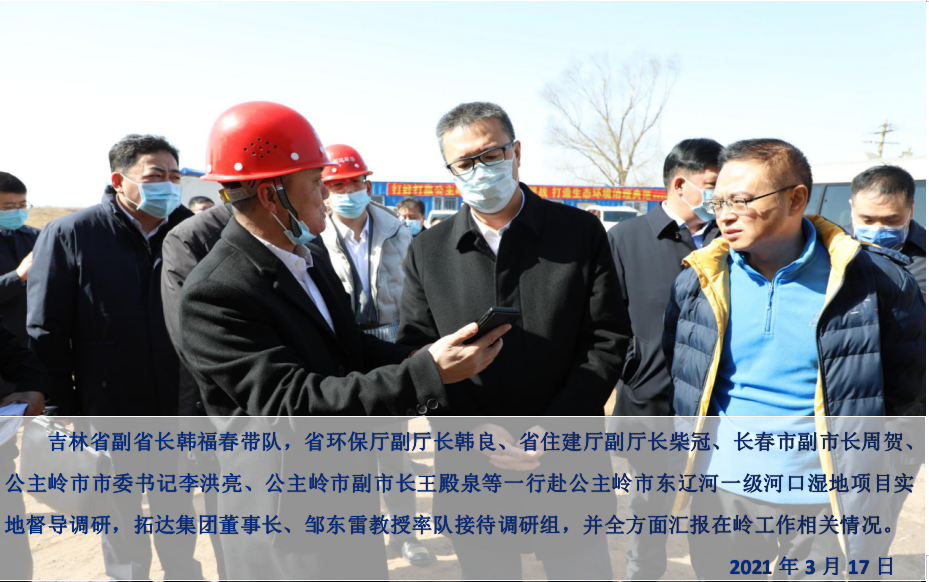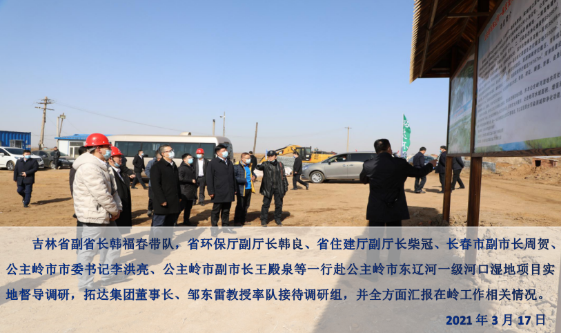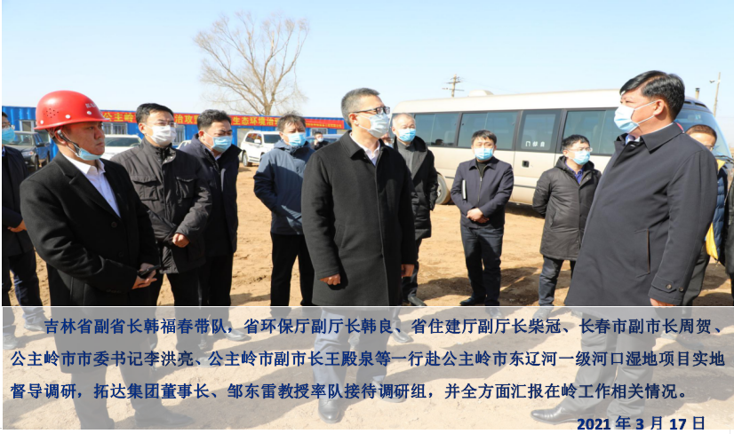 2021年3月17日上午,吉林省副省长韩福春带队,省环保厅副厅长韩良、省住建厅副厅长柴冠、长春市副市长周贺、公主岭市委书记李洪亮、公主岭市副市长王殿泉等一行对我公司承建的公主岭市东辽河一级支流河口湿地项目、东辽河流域公主岭段缓冲带生态修复与土地综合利用项目及湿地运营情况进行实地调研及工作督导。